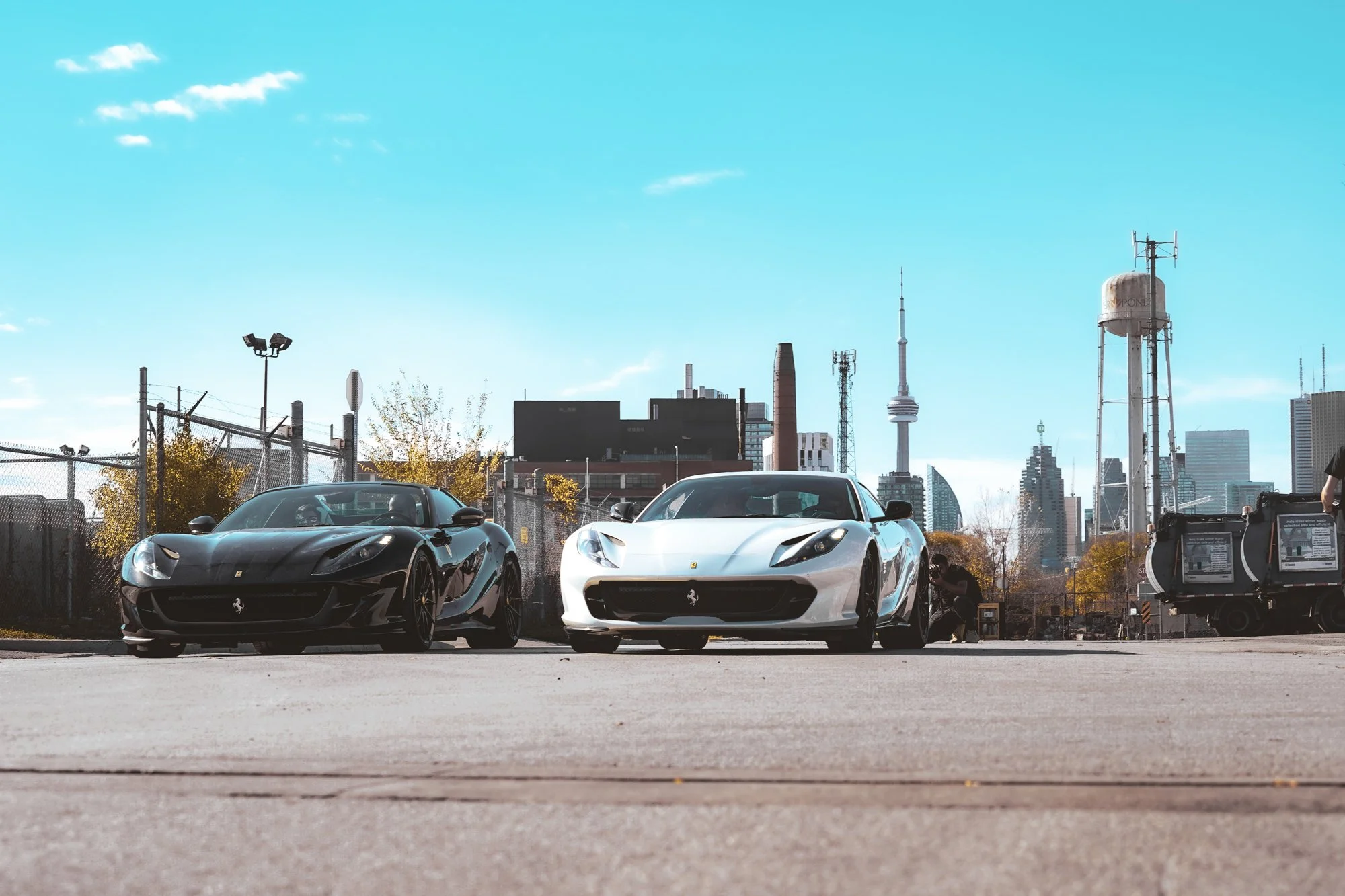 A wide lens is great for shooting cars because of the framing. You can capture some really cool shots by complimenting your subject within its environment. So as can you see, we got two half - million dollar supercars and a beautiful Toronto skyline as our background. Your'e damn right I'm gonna set these cars up for a shoot.
